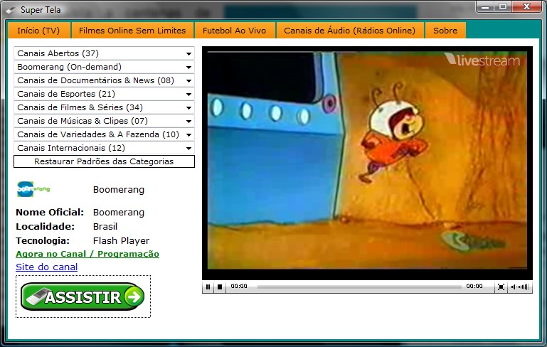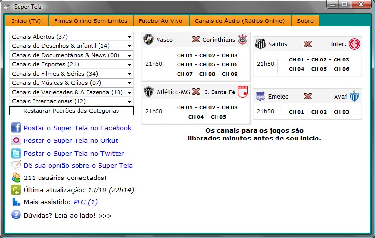 O Super Tela não permite que você insira ou delete nenhum dos canais pré selecionados, diferente de softwares como o MegaCubo. Entretanto, o programa mostra sempre as atualizações do sistema, mantendo os canais sempre à disposição. Tudo atualizado Para que os streamings rodem sem problemas, é necessário que você possua tanto o Flash Player quanto oInternet Explorer em suas versões atualizadas, além do .NET Framework. O programa não se responsabiliza pelo conteúdo do streaming, apenas organiza os conteúdos para acesso. Gratuito